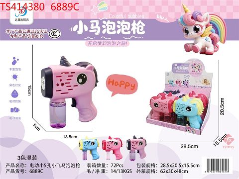 产品名称: 电动小5孔小马泡泡枪(带灯光,配泡水50ML*1,4*AA不包电,8只/盒)