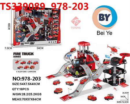 产品名称: 过家家玩具消防轨道三层停车场加三层大楼停车套装 (6只合金小车+1只飞机)