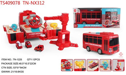 产品名称: 灯光音乐方向盘变形吊塔巴士消防车带4只合金回力车