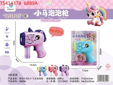 产品名称: 电动小5孔小飞马泡泡枪(带灯光,配泡水50ML*1,4*AA不包电)